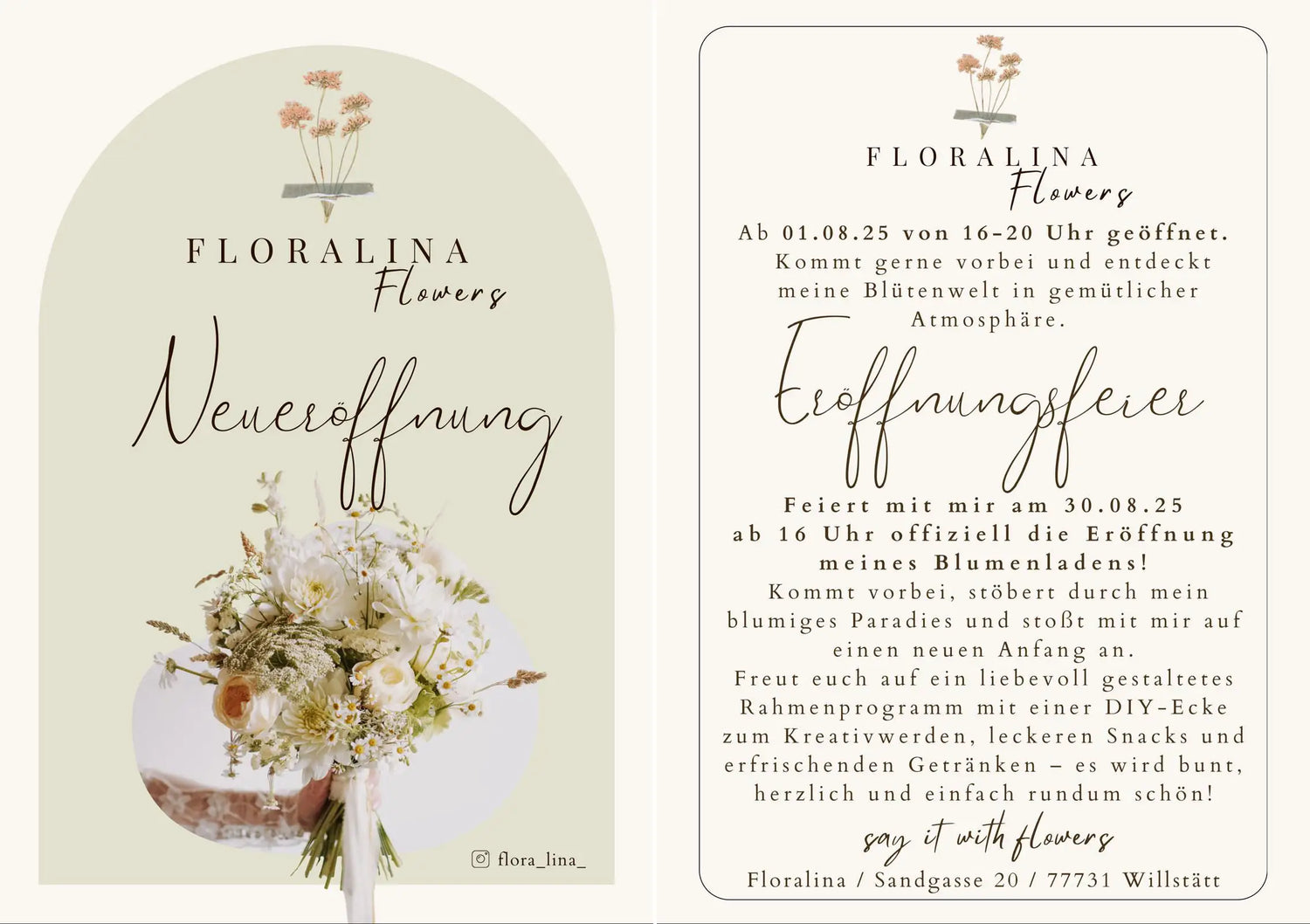 Am 1. August war es soweit: Mein Blumenatelier wurde eröffnet! Und das möchte ich mit Euch gebührend feiern: Am 30. August von 16:00–20:00 Uhr in der Sandgasse in Willstätt. Ich freue mich auf Euch!